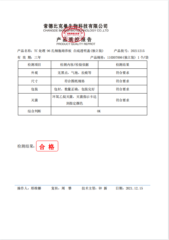 比克曼生物 TC處理 96孔細胞培養(yǎng)板 白底透明蓋 (獨立裝) 1個袋 110307006 20211215